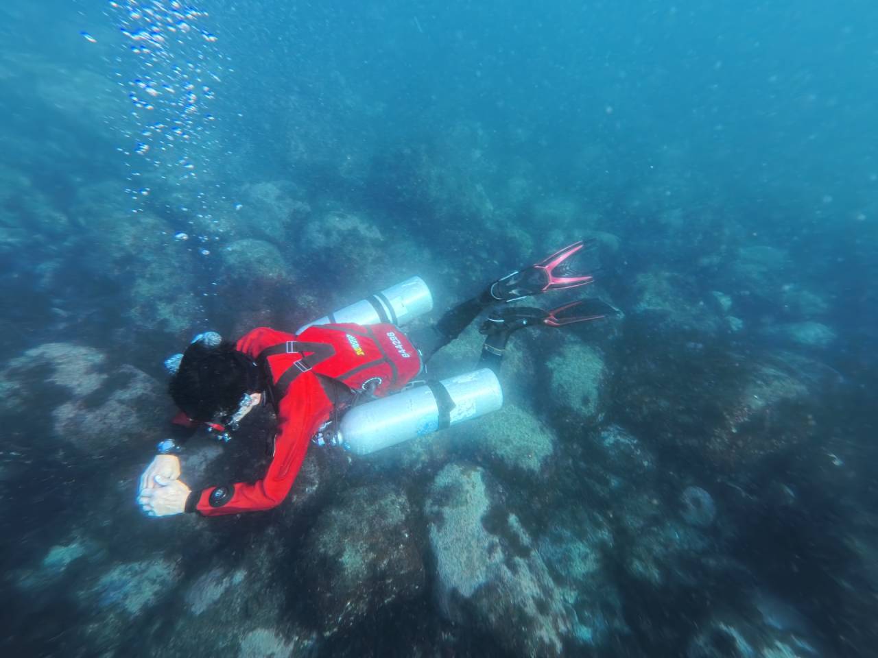 今日は、サイドマウント特有のホース取り回しや姿勢づくりのチェックを中心に練習しました。