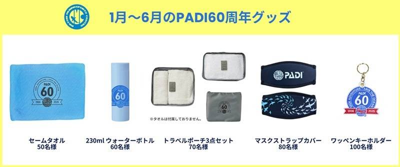 時期ごとに、以下のようなPADI60周年記念グッズが用意されています。